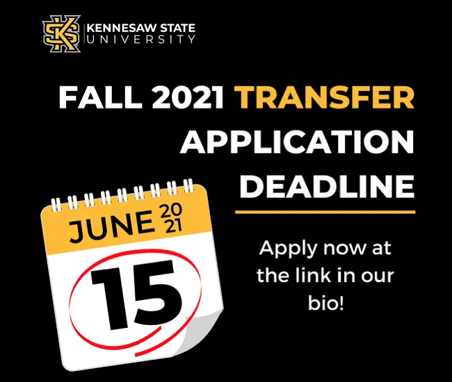 Hooty Hoo - We can't wait for you to transfer to KSU! The transfer application deadline for Fall 2021 is June 15, and all supporting documents are due by June 30. Apply now HERE!
